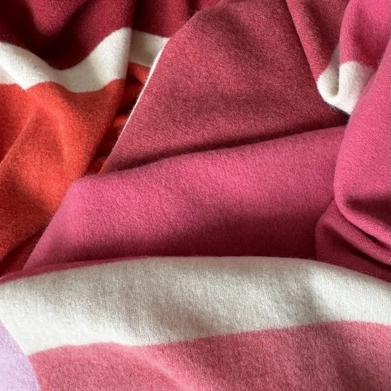 Our Davis Dove throw is made from 100% fine merino lambswool and is exceptionally soft and cosy. Bold stripes of silver and flannel grey are highlighted by lively coloured stripes. Knitted in Scotland and hand finished by our skilled craftspeople.